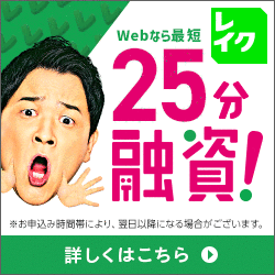 | 融資時間 | 最短即日振込可(来店不要)*21時(日曜日は18時)までのご契約手続き完了(審査・必要書類の確認含む)で、当日中にお振込みが可能です。 *一部金融機関および、メンテナンス時間等を除きます。 |